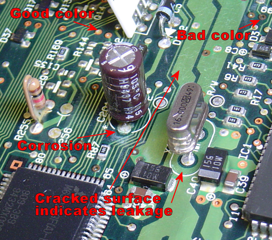 The 2G (1995-1997) ECUs have started suffering more and more from caps leakage as well. We started noticing this increasing trend in 2008. Even though it was still pretty rare, we decided at that time to start replacing caps in 2G ECUs as well. They're getting close to 15 years old now, so it's definitely time. 2G ECU leakage can be more subtle to detect, so we're providing a picture below with tips on what to look for.