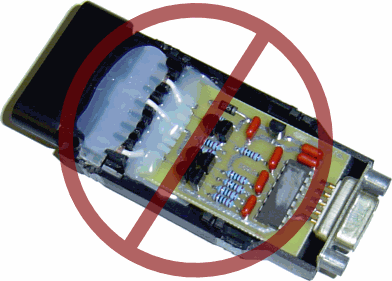 A bit harder to identify without opening the case, but this adapter is actually longer than ours, has a different DB9 connector and clearly different internal components. Our adapter boards are all surface mount IC components, a much better choice for use in a noisy car environment than the through-hole components shown on this copy.