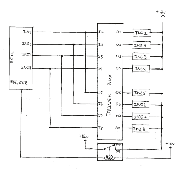 You'll notice that the stock injector resistor pack is missing from the diagram. That's on purpose. You don't use it. The peak/hold drivers provided by the driver box simply don't need the inline resistors.