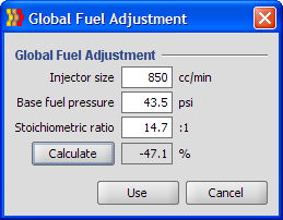 To help with this, there is a “calculate” button on the Fuel tab near the Global fuel adjustment area. Click this Calculate button and enter appropriate values for your specific setup. The following screenshot shows a “typical” FIC 850 configuration on gasoline with a 2G ECU.