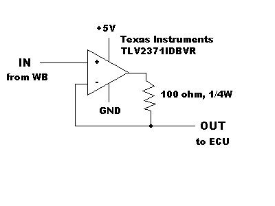 If the sensor is a 5V sensor that draws little current, like a MAP sensor, connect the sensor's power, signal and ground connections to the input side of the buffer circuit assembly. If the sensing device, such as a wideband, has its own power and ground, connect only the sensing device's signal wire to the input side of the buffer. In either case, you still must provide +5V and GND to the buffer circuit and you must then insulate any unused wires.