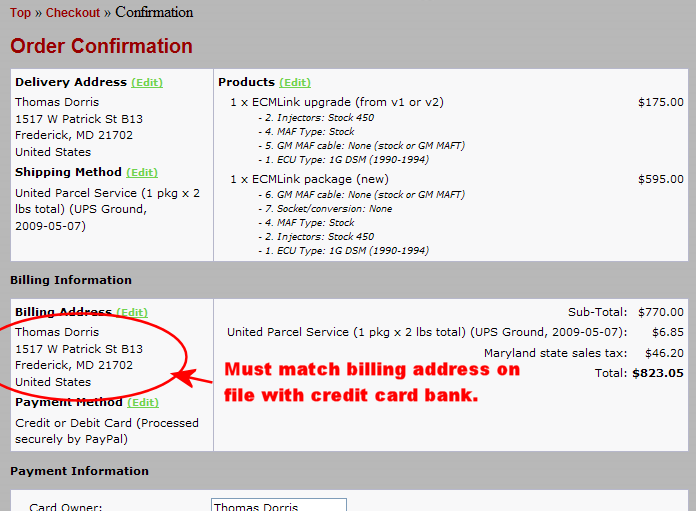 By FAR, the most common problem people have with submitting orders on our site is the generic “Order can't be processed” or “Transaction failed” message. This is almost always the result of a mismatch in the credit card billing address and the address entered by the user. The following illustrates how to check this.