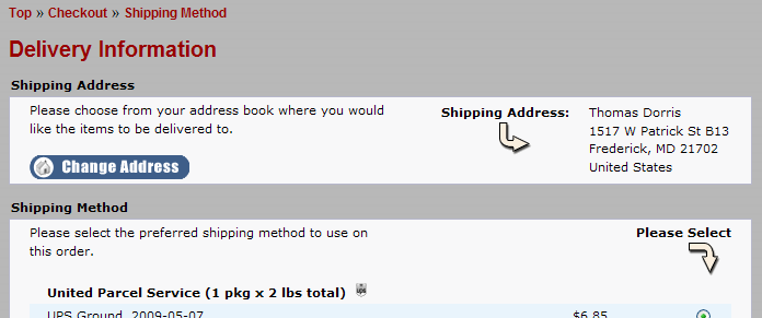 The first step in our checkout procedure is where the customer selects his or her delivery address. This is where the package will be mailed and may be different from the address associated with the customer's credit card billing statement.