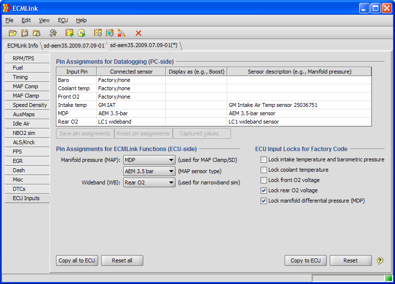In order to datalog an aftermarket sensor in the ECMLink application, you must first tell the application where to find the sensor (which ECU input pin it's connected to). You do that in the “Pin Assignments for Datalogging (PC-side)” section of the ECU Inputs tab shown to the right (click to enlarge).
