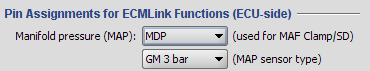 Because you can connect your MAP sensor to any number of ECU inputs, you have to tell the ECU where it can find this sensor in order to use it for SD operation. You do this on the ECU Inputs tab in the “Pin Assignments for ECMLink Functions (ECU-side)” area.