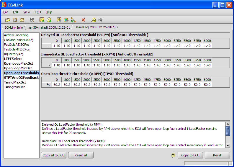 The image below shows a fairly typical setup for the various open loop threshold tables you can use to extend closed loop mode for this test. Keep in mind what you're doing here, though. You're basically telling the ECU to maintain stoich air fuel ratios under more load (LoadFactor) and with more throttle. This could very well produce a hotter mixture than you'd like to maintain for any lengthy period of time. So monitor EGTs if possible or if not, just try not to stay under high load/closed loop mode for very long.