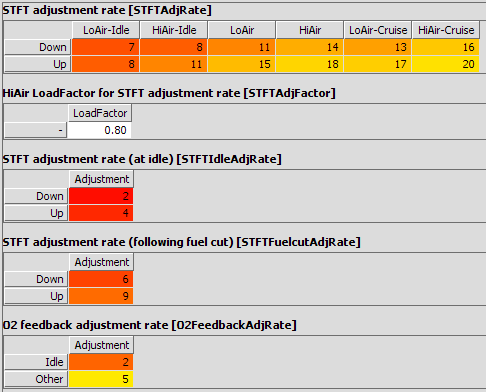 To correct for this, you need to change how the ECU adjusts the short term fuel trim. You do that in the STFTAndO2Feedback panel in Direct Access. The following illustrates a stock 2G DSM configuration.