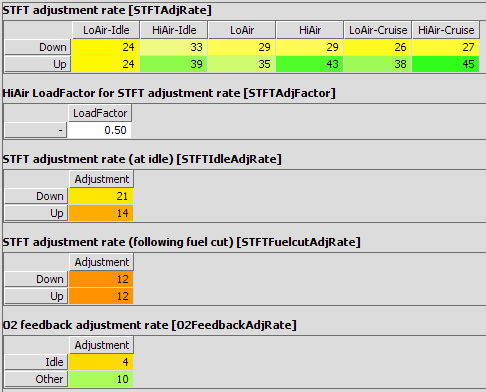 To correct for this, you need to change how the ECU adjusts the short term fuel trim. You do that in the STFTAndO2Feedback panel in Direct Access. The following illustrates a stock 2G DSM configuration.