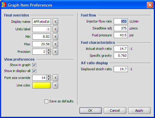 Get AFRatioEst in your graph legend and then edit the display preferences (follow the same procedure as outlined above for BoostEst). You'll need to configure the preferences as exactly as possible. Provide information on injector size, your configured deadtime adjustment, and base fuel pressure. You also need to configure information about the fuel you're running. If you're running regular pump gas, then just leave the defaults of 14.7:1 for actual stoich ratio and 0.760 for specific gravity. The following shows a typical 2G setup configured for 850 injectors and pump gas.