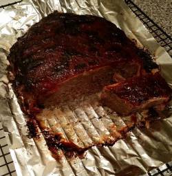 Make the sauce (mix all ingredients listed above together) and pour 1/3 of the mixture over the top of the bacon. Spread evenly over the whole meatloaf.