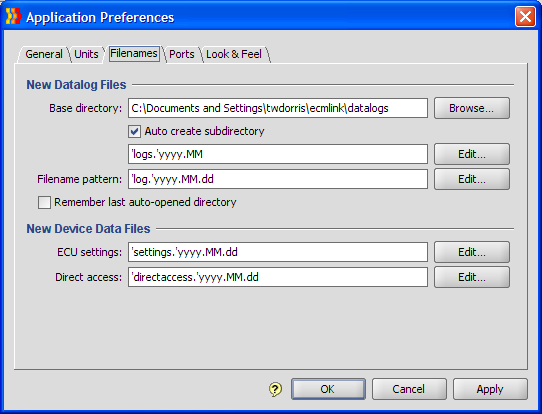 “Capturing” (F12 or ECU→Start capture) does the same as streaming, but also writes the data to a log file automatically. The name of the log file it creates is determined by the Filenames preferences (Edit→App preferences). Pull up this dialog and hit the “?” at the bottom for a lot more information on how filename preferences can be configured.
