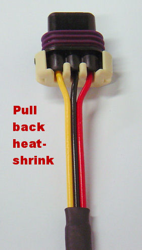 You'll want to pull the heatshrink and shielding down, away from the GM MAF connector so that (1) you get some extra length on the cut wire and (2) so that the cut (and any exposed wiring fragments) is left protected underneath the heatshrink when you return the shielding to its original position.