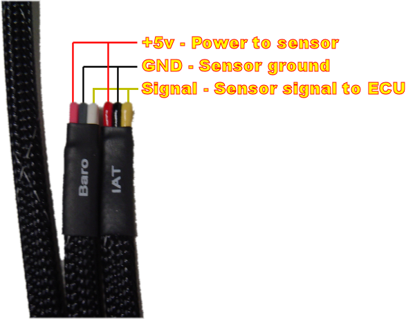 Our GM MAF cable provides breakout points for the Baro and IAT inputs to the ECU. The image below illustrates the layout.