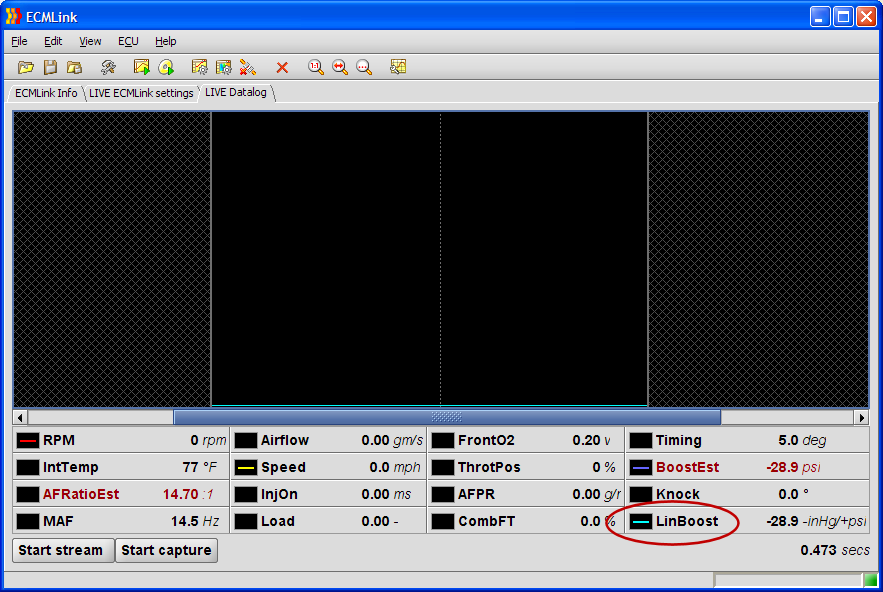 The LinWideband item works exactly the same except, of course, units are displayed as A/F ratio instead of pressure. However, some wideband units don't faithfully follow the characteristics shown in their documentation. If this is the case, you'll probably need to empirically determine the settings necessary to obtain agreement between the values displayed directly by the wideband unit and those displayed by ECMLink. Probably the simplest way do this is to add RawLinWideband to your displayed values (click the Raw value button on the Display Values dialog). Then lock the ECU in open-loop mode and force a stoichiometric measured (displayed by the wideband unit) A/F ratio (Lambda = 1.0, gasoline A/F ratio = 14.7:1). Observe the logged RawLinWideband voltage. Set Max volts to the observed value and set Max lambda to 1.0. (If you are using ECMLink's narrowband simulation, this observed voltage will also be NBO2 sim's WB switch point.)
