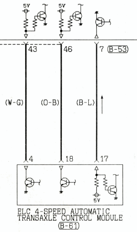 Look at pins 43 and 46 on the ECU side. You'll see a +5v pull up resistor on each input. That means, when nothing is connected to that input (or when the TCU output is “inactive”), the ECU's sense circuit will “see” 5v. Which means in order for the AT to “active” that input, it will need to switch the input to ground (which is what the transistor with a connection to ground illustrates on the TCU side).